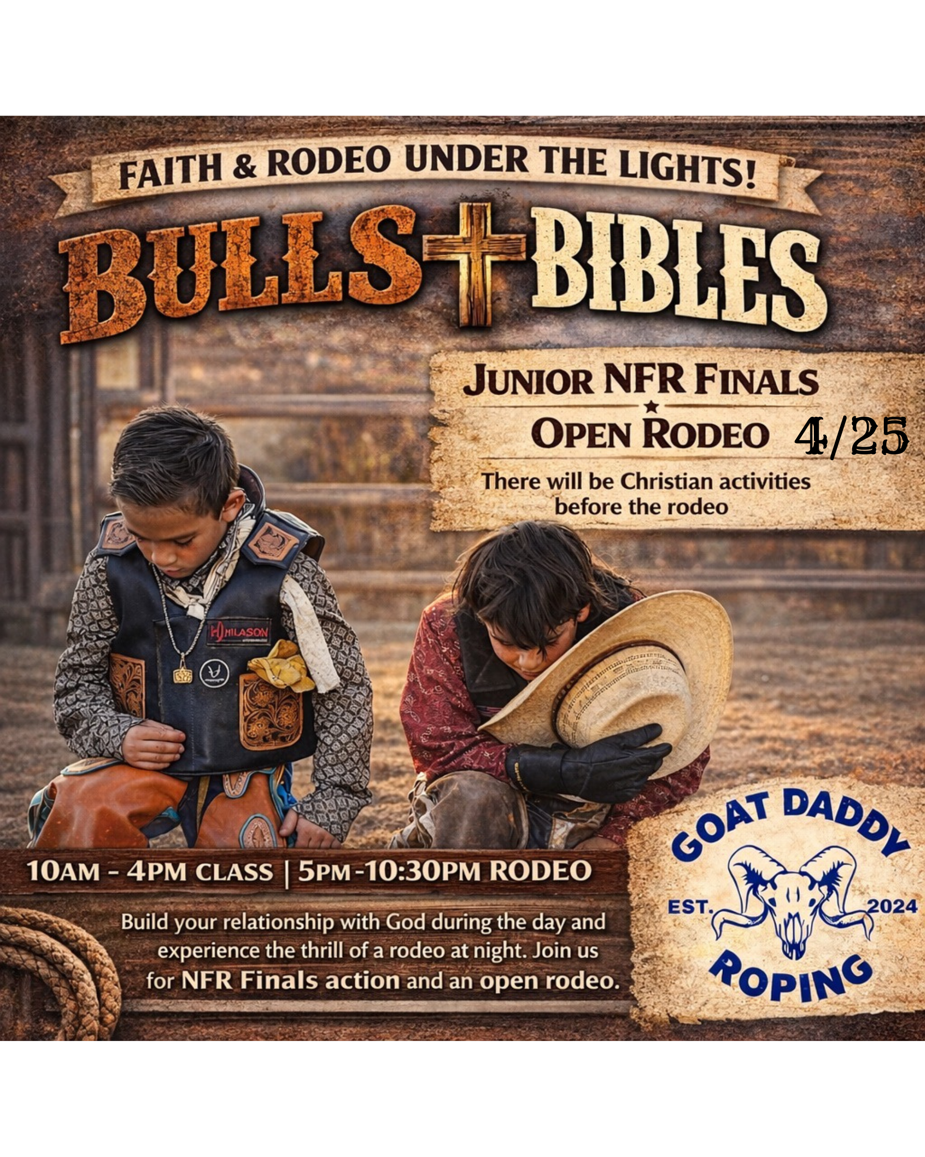 Join us for an unforgettable day where faith meets the arena at Bulls + Bibles — a powerful Christian rodeo experience brought to you by Goat Daddy Roping.